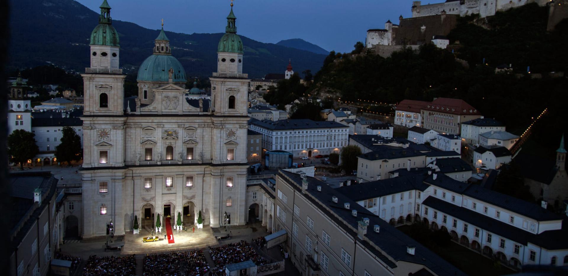 Der zwischen 1614 und 1628 nach Plänen von Santino Solari errichtete Salzburger Dom, die größte frühbarocke Kirche nördlich der Alpen und gleichzeitig die älteste Bischofskirche des heutigen Österreich, bildet einen eindrucksvollen theatralischen Hintergrund für die Moralität nach mittelalterlichem Vorbild: Keine Kulisse kann die überwältigende Wirkung der mächtigen Doppelturmfassade aus weißem Marmor mit Christus als Weltenherrscher auf dem Giebel zwischen den Türmen ersetzen. Der geschlossene Platz zwischen fürsterzbischöflicher Residenz und Stift St. Peter bietet rechts und links der Fassade Durchgänge, die für Auftritte und Abgänge genützt werden können. Das Flachdach über diesen Dombögen eignet sich für Rufer und Bläser. Den Domtürmen gegenüber sticht der gotische Spitz der Franziskanerkirche empor, auf dem ebenso wie auf anderen Kirchtürmen der Altstadt sowie auf dem Mönchsberg und Kapuzinerberg jene Männer stehen, die Jedermann in den Tod rufen. Max Reinhardt überließ die Lichtregie der Sonne: Das Spiel begann um 17.00 oder 17.30 Uhr, wenn der Großteil des Platzes noch in gleißendem Licht liegt. Beim Auftritt des Todes wurden die Schatten lang, wenn der Teufel kam, war das Sonnenlicht verschwunden.