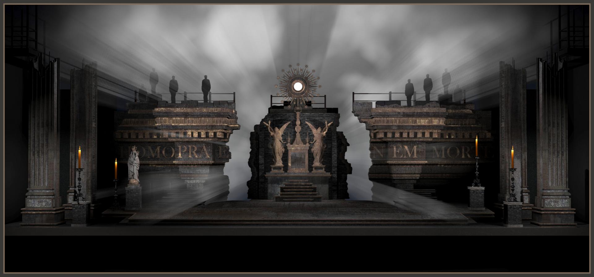 The voices of Spoletta, Sciarrone, and the soldiers are heard, shouting that Scarpia is dead and Tosca has killed him. As the men rush in, Tosca rises, evades their clutches, and runs to the parapet. Crying "O Scarpia, avanti a Dio!" ("O Scarpia, we meet before God!"), she flings herself over the edge to her death.